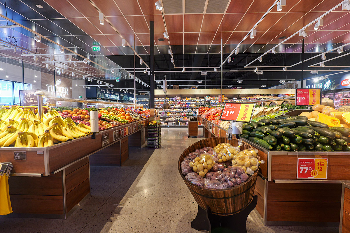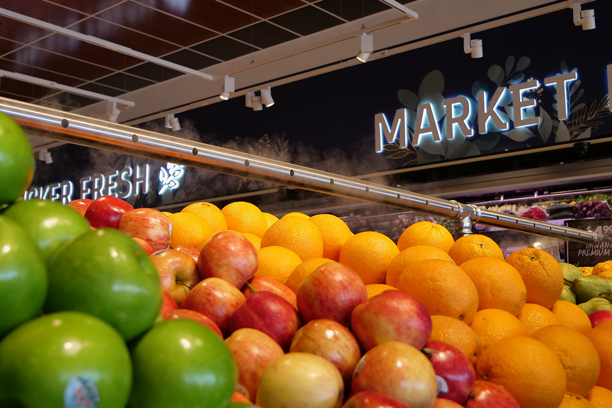 We installed 3x systems running to an ambient display produce bunk using 54mm stainless steel distribution bar and a banana end with 2x stainless steel mushrooms, running to the 5.4m ambient display produce bunk with a 54mm distribution bar and 1x humidification system to the 7.5m fridge case display using 38mm distribution bars.